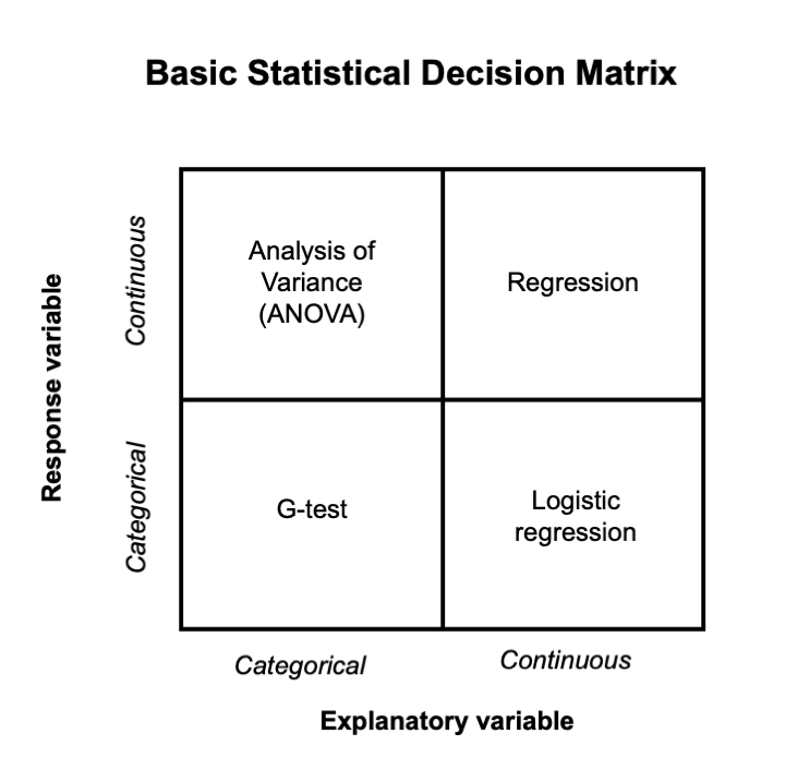 The data type of both the explanatory and response variables determines which statistical test we use. Selecting the right test is important because it ensures that we’re asking a question our data can actually answer.