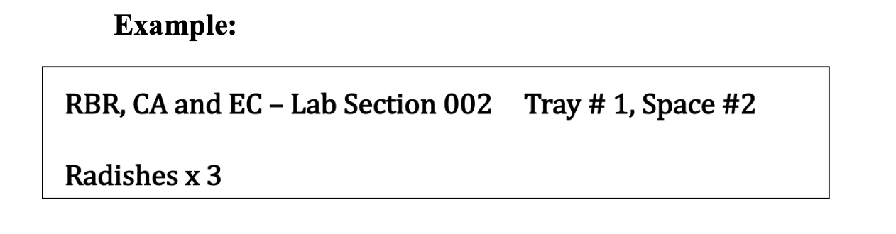 - Carry out your experiments. Each group of students will have the use of at least 12 small pots, labeled with your names. Note that most questions/hypotheses will require more than one pot (for example, pots for controls and treatments). Thus, the number of questions and tests carried out may vary among pairs of students. Carefully record the species and number of seeds used on a white label inserted into each pot so you know for sure what each pot contains. Each white tag should include: Your group’s initials and lab section number. Tray # and Space # and what’s in each pot and the quantity.